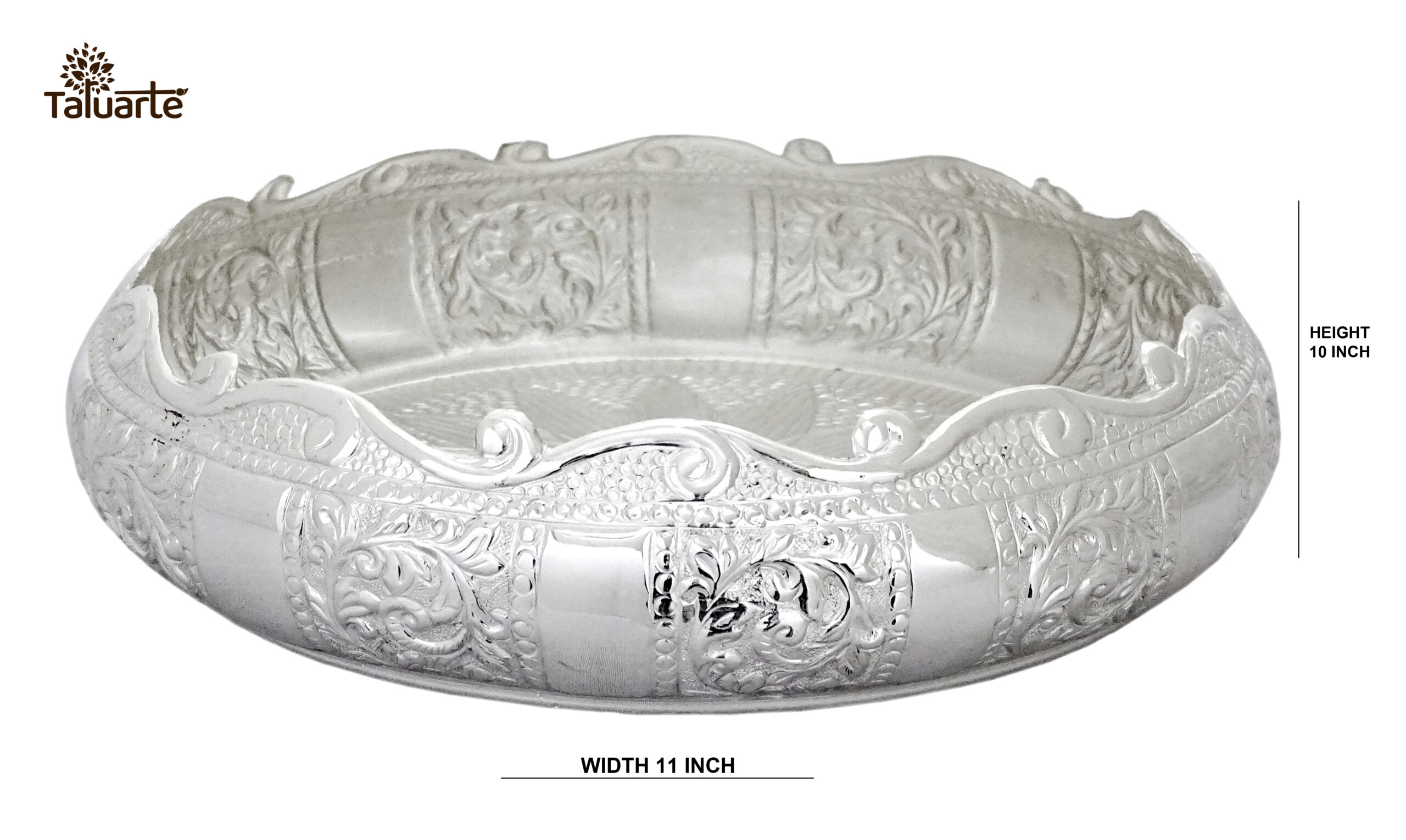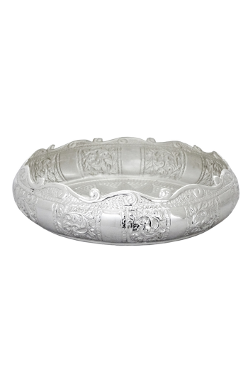This ornate silver-finish urli features hand-engraved floral motifs inspired by royal palace ceilings. Crafted by a third-generation artisan who learned the art beside his grandmother, each curve holds her whispered stories and blessings from their ancestral home workshop in Jaipur.
