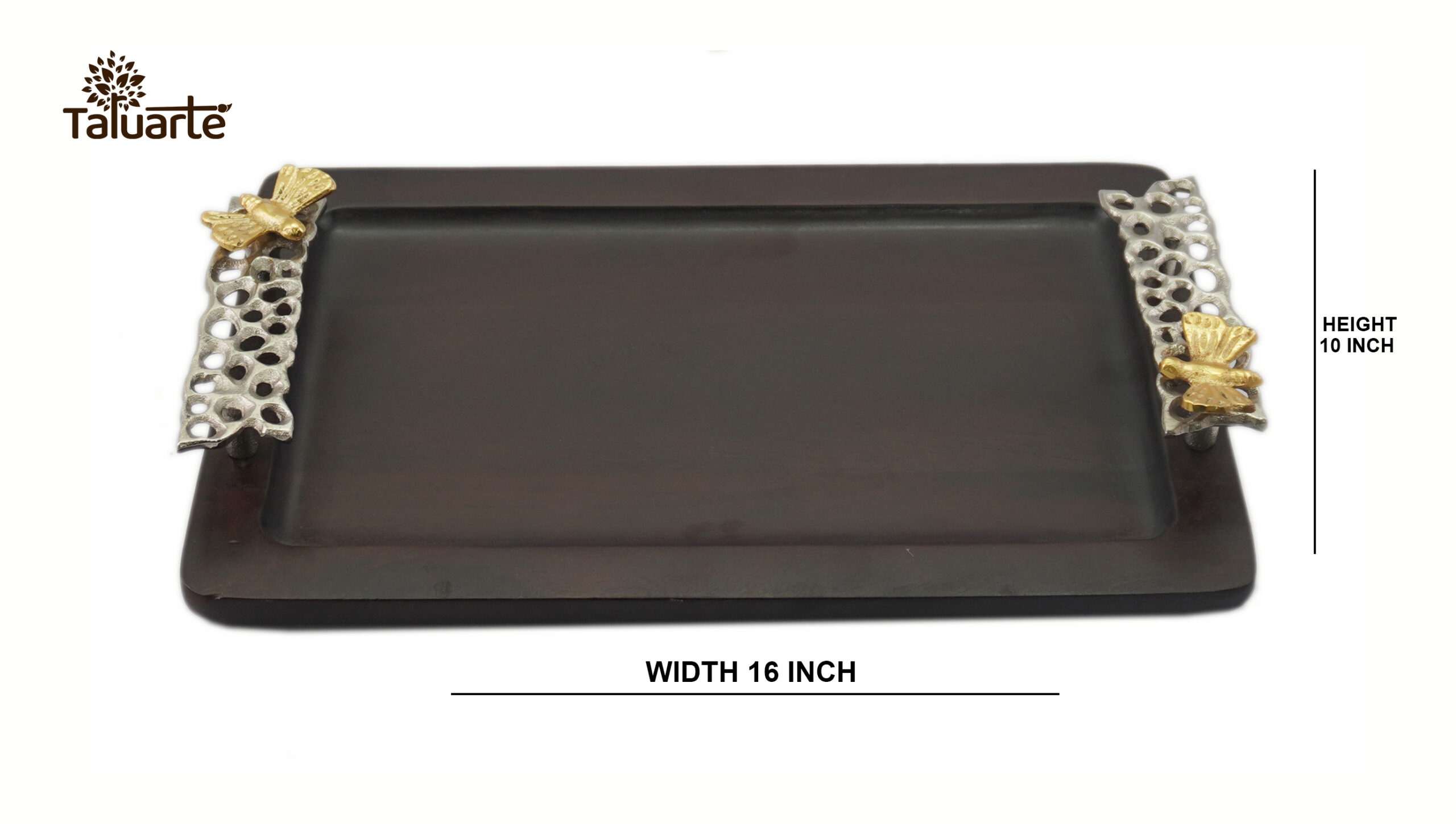 This elegant wooden tray features delicately cast metal handles with golden butterflies, symbolizing transformation. Crafted by a widowed artisan in memory of his late wife, each piece carries her spirit—she believed every home deserved a touch of beauty and grace.